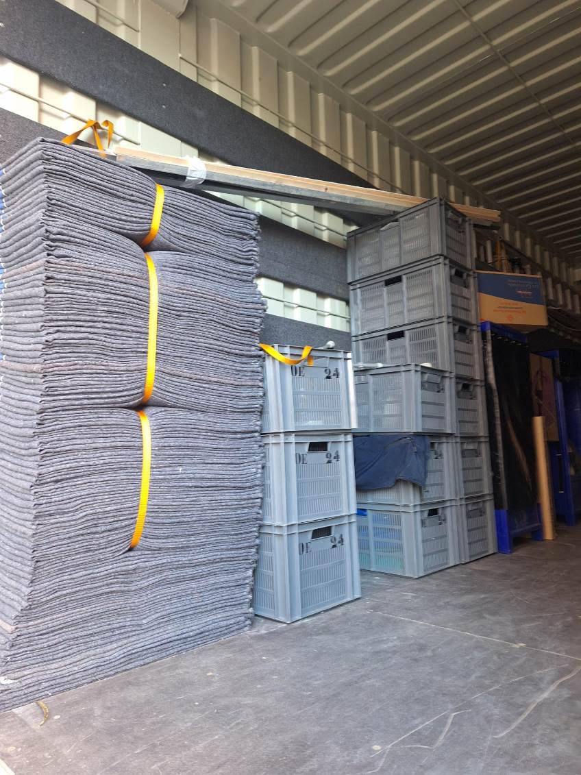 De ce fait, la journée est rythmée par des allers-retours coordonnés. L’utilisation de transpalettes électriques, monte-meubles et bacs numérotés optimise les délais tout en limitant l’arrêt de l’activité de notre client.